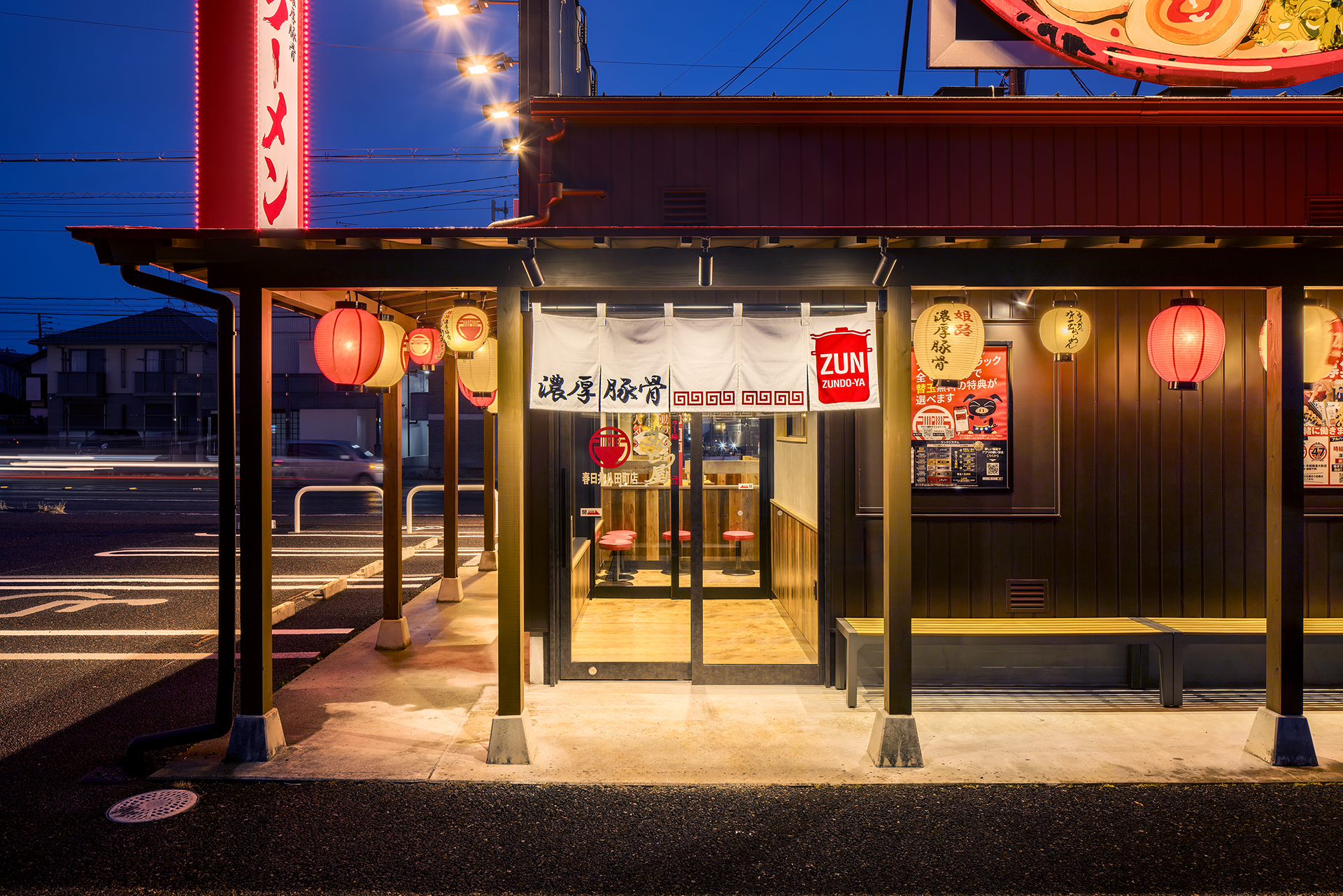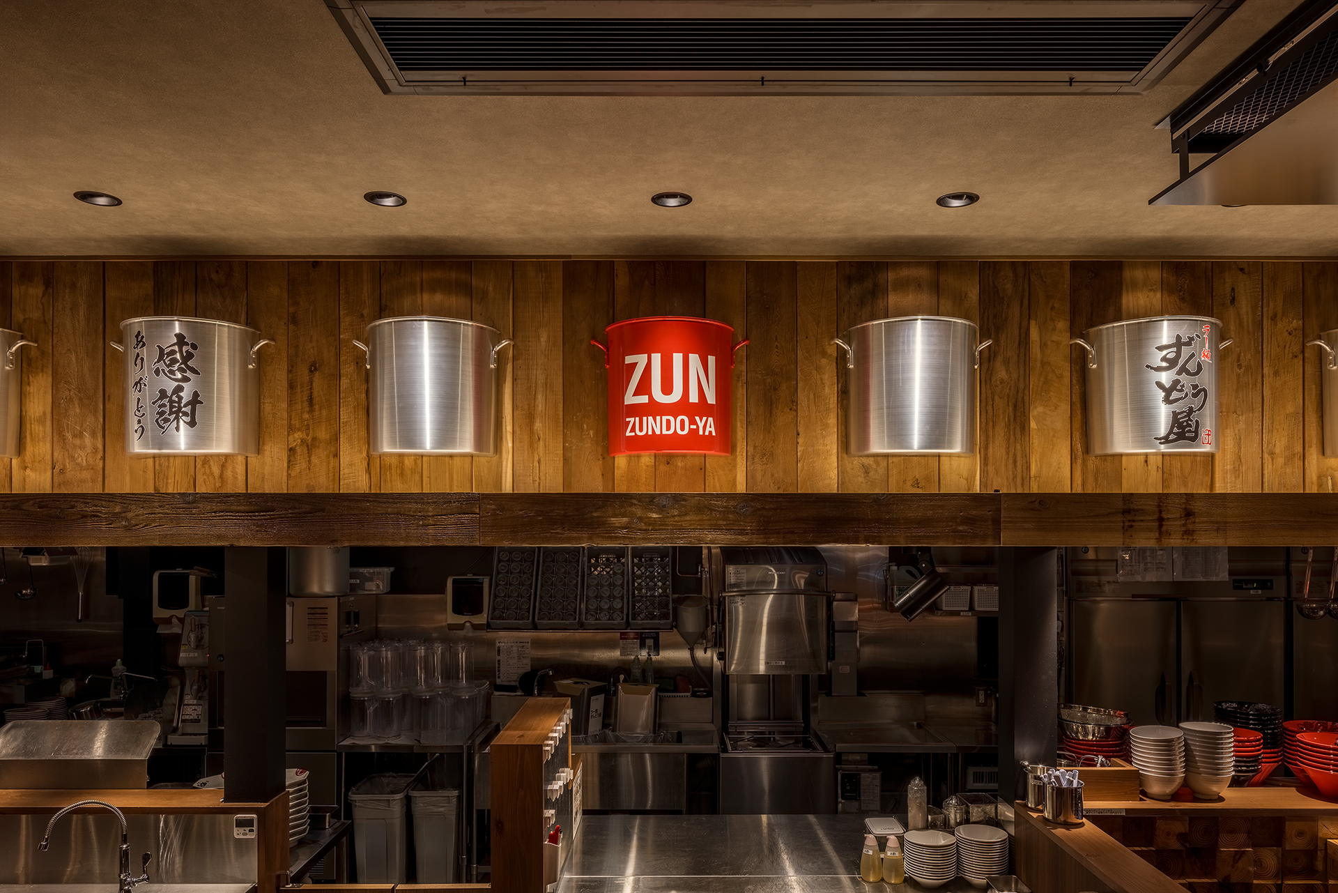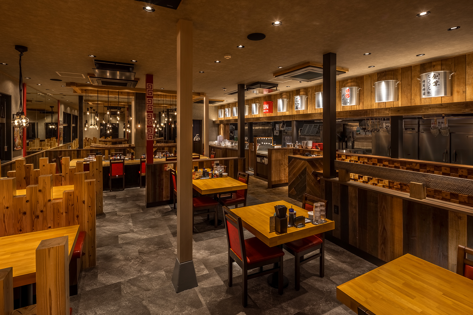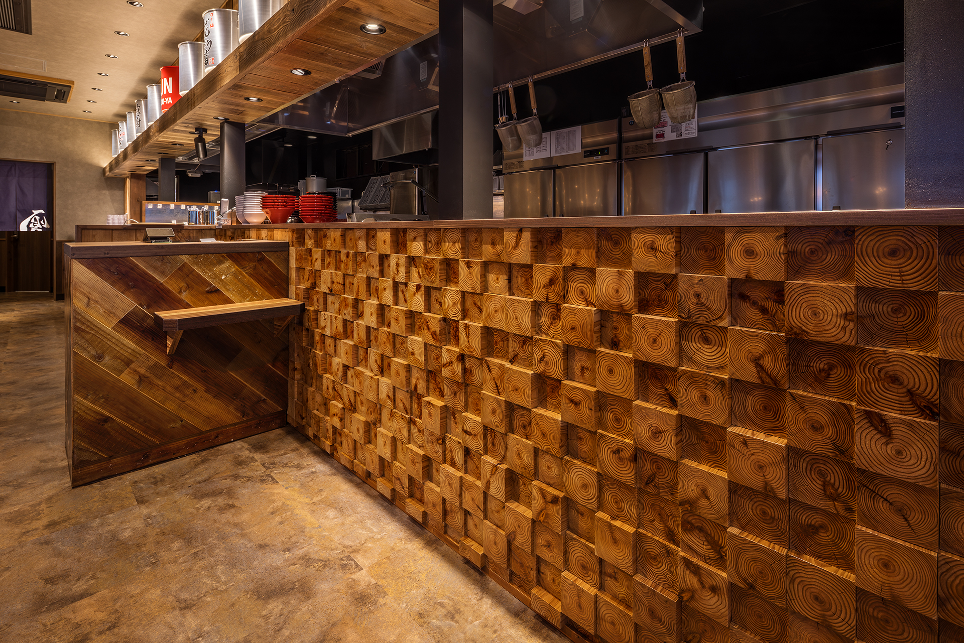 無垢の木材をふんだんに使用した店内 迫力ある看板 そして看板のラーメンは手書きで表現しました