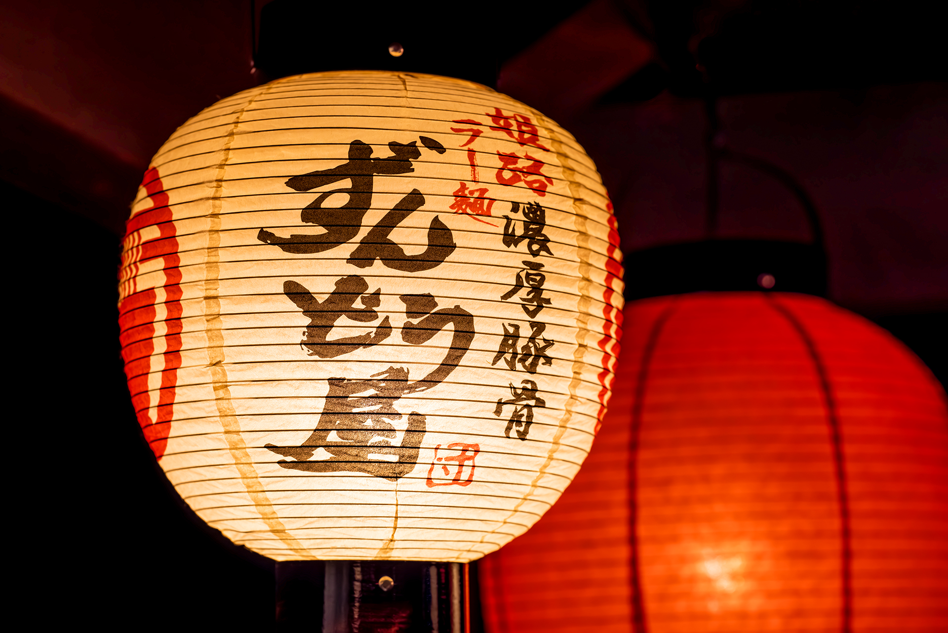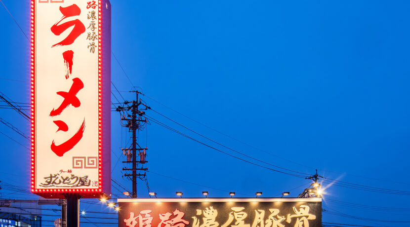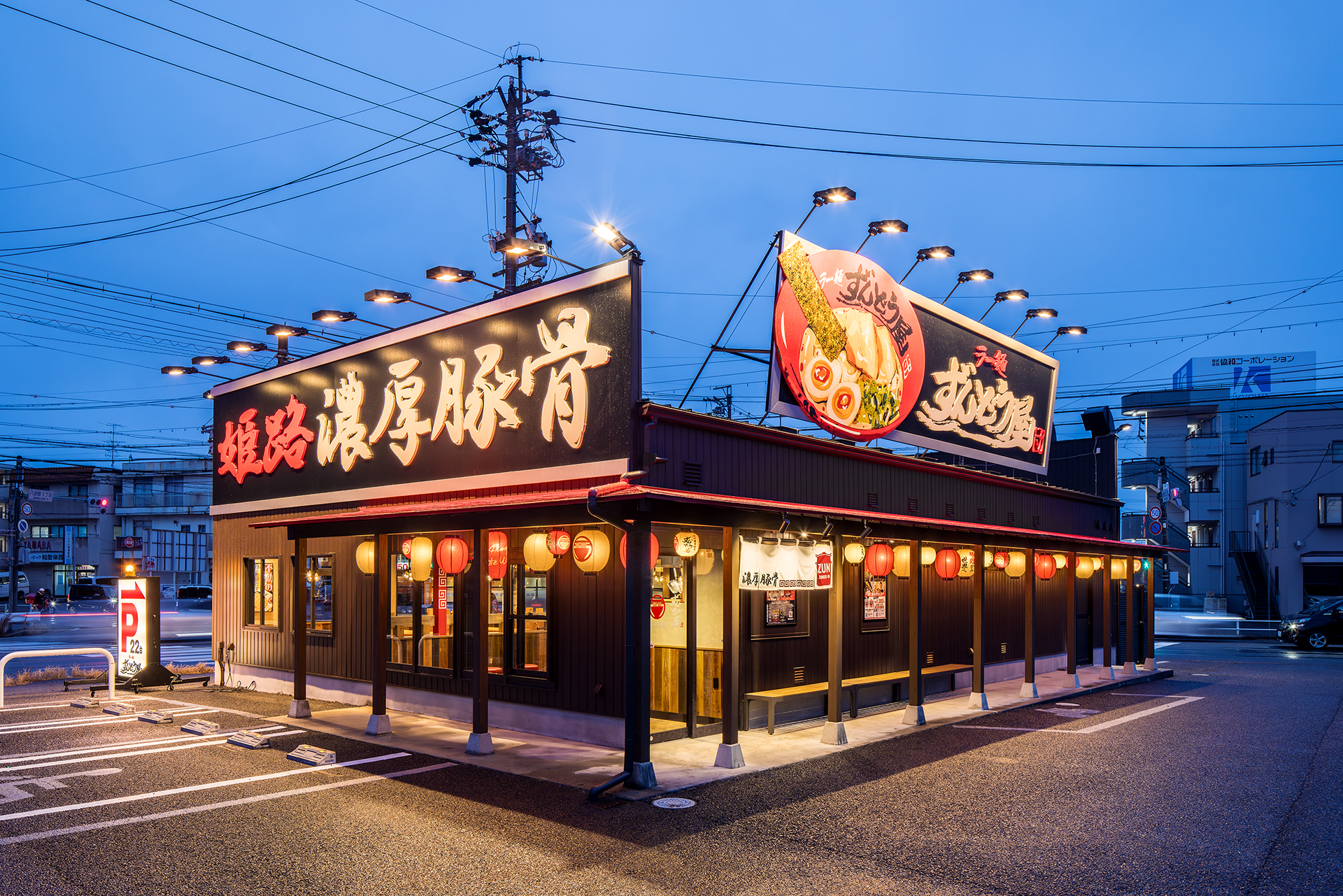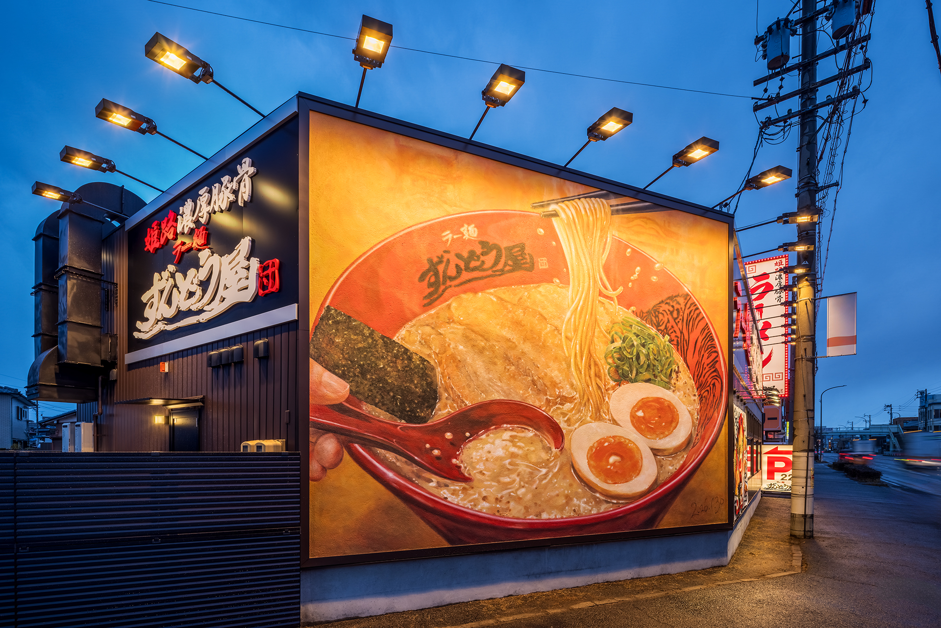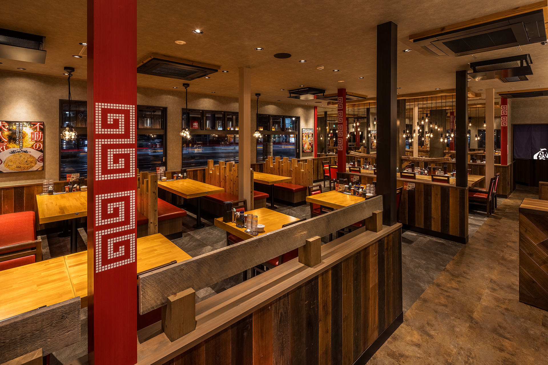 無垢の木材をふんだんに使用した店内 迫力ある看板 そして看板のラーメンは手書きで表現しました